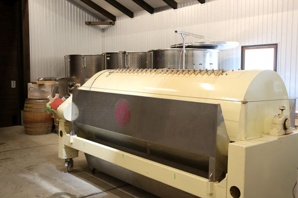 昔は鉄板で潰していたそうですが、種などは潰すとえぐみや渋みに繋がる成分が多く出てしまい、質の悪い味になるということで、現在はこの圧搾機を使って優しく搾っているそうです。特に白ワインの場合は、種を潰さないように優しくゆっくり搾っていきます。